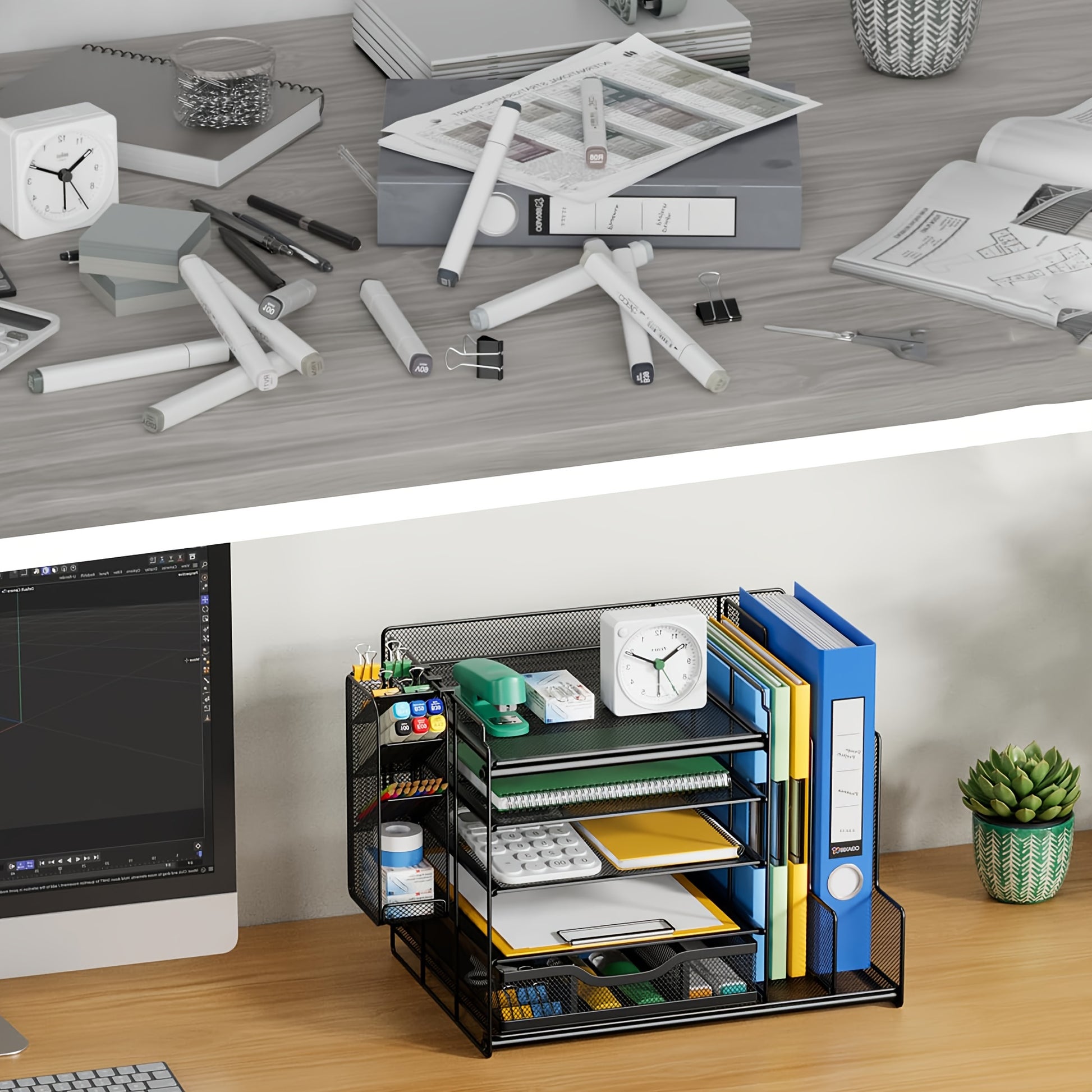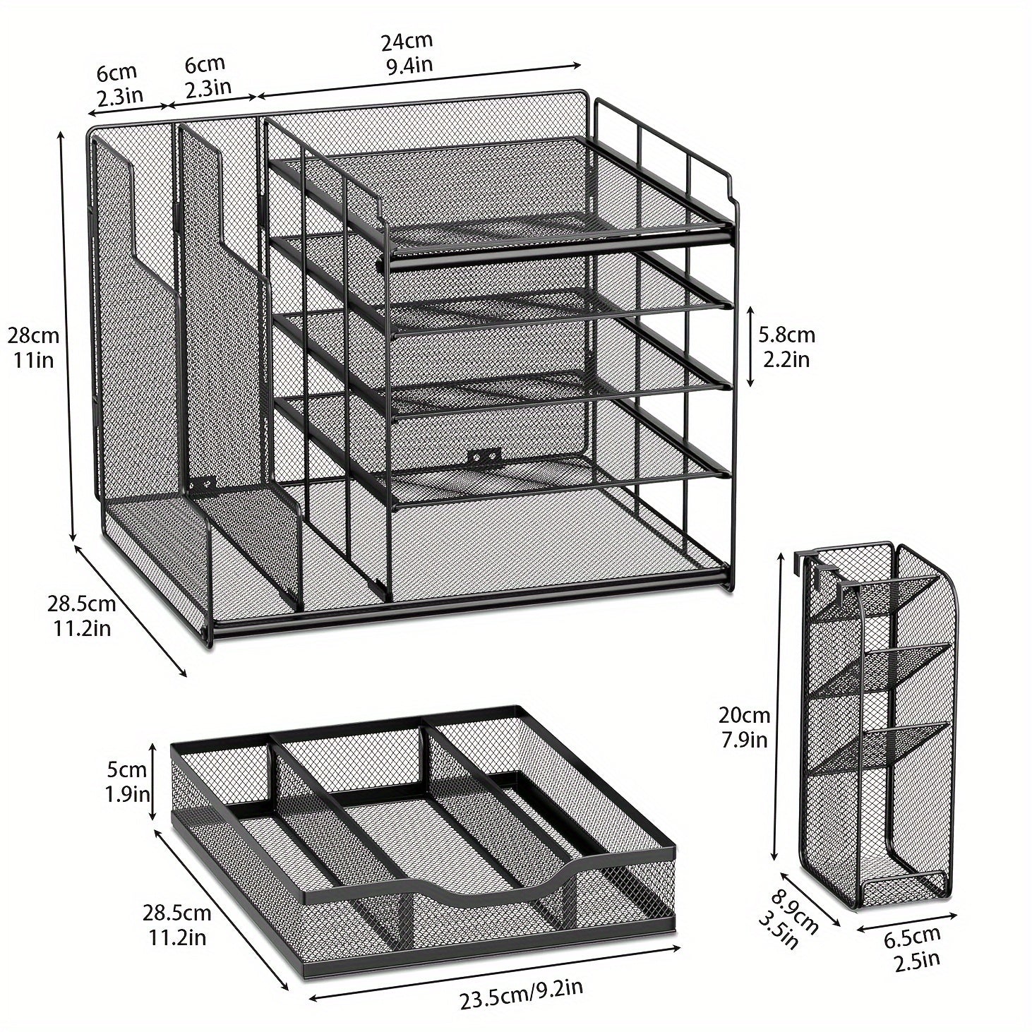 1.Declutter Your Workspace: Transform your chaotic desk into an organized haven, freeing up space and reducing distractions 2.Durable Metal Construction: Crafted from high-quality metal mesh with a baked finish, this organizer ensures lasting durability and resists deformation over time