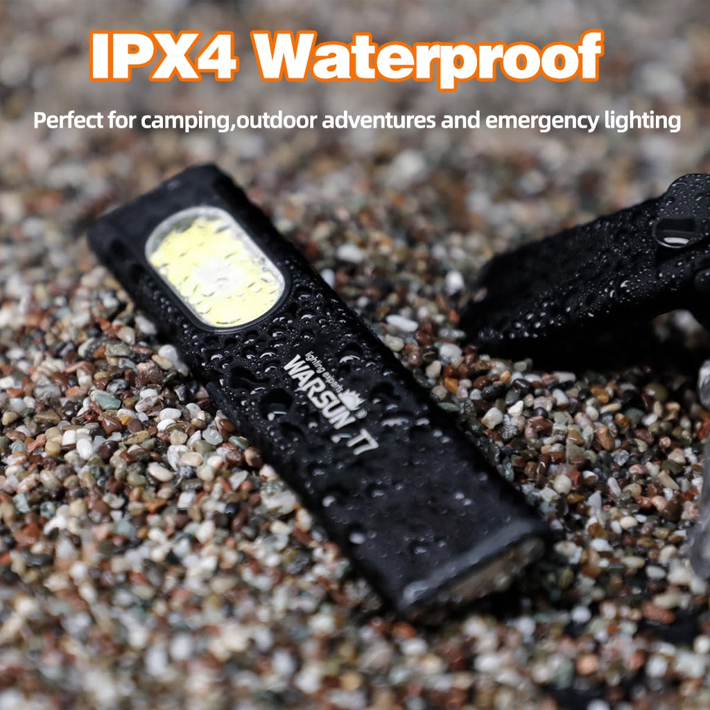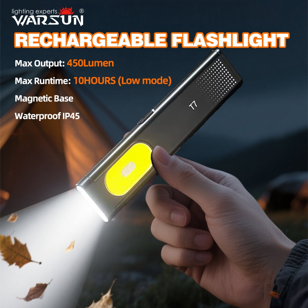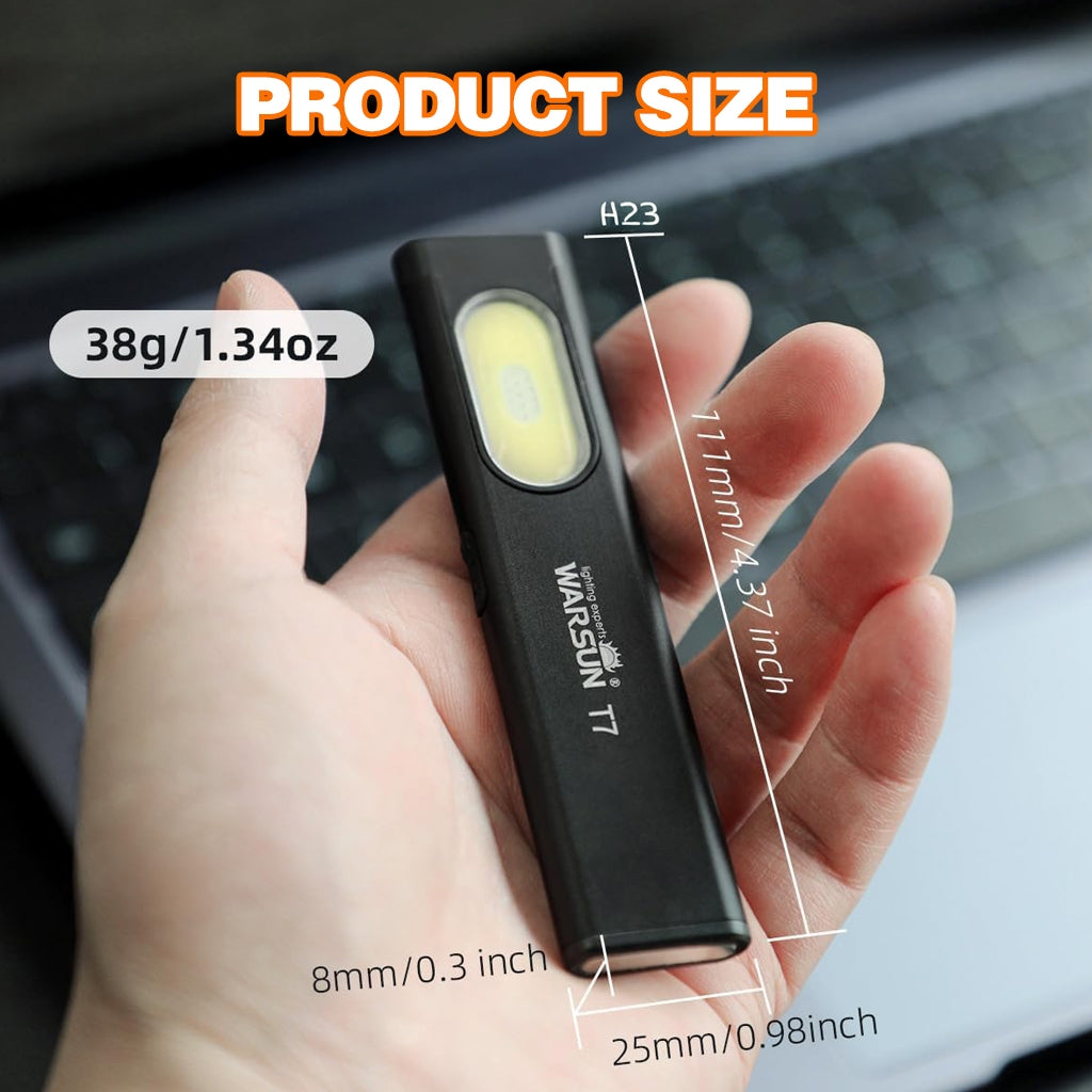 【Product information】 ➣ Model: T7➣ Material: Aluminium alloy+ABS➣ Brightness: 450Lm(≥40 M)+200Lm➣ Battery capacity: 450 mAh➣ Work Time:2-10 hours➣ Waterproof grade: IPX4➣ Charging method: Type-C➣ Weight: 50G➣ Size: 106*25*15mm➣ Others: Bottom magnetic suction 【Product Description】☆【IPX4 Waterproof Torch Light】Engineered with IPX4 splash-resistant rating, this compact flashlight survives rainy hikes and damp camping nights.At merely 50g, it''s your go-to waterproof companion for outdoor adventures without bulkiness.☆【650-Lumen Camping Flashlight】Experience brilliant 360° illumination with Warsun T7''s 650-lumen output.Six adjustable modes (from moonlit soft to spotlight strong) adapt to hiking trails, tent setups, or household emergencies effortlessly.☆【Smart Runtime Management】The 450mAh battery lasts 10 hours on medium mode.Quick-access modes prevent power aste – switch to eco-light for prolonged camping trips effortlessly.☆【Palm-Sized Outdoor Essential】Designed for backpackers, the credit-card-sized body slips into pockets effortlessly.Military-grade aluminum casing withstands drops while maintaining featherlight portability for climbing/camping.☆【Family-Ready Safety Torch】From blackout emergencies to backyard BBQs, this waterproof flashlight serves dual roles. Magnetic tail base sticks to metal surfaces, freeing hands for setting up tents or fixing bikes during family outings. 【Package includes】 1 * Flashlight 1 * Charging cable