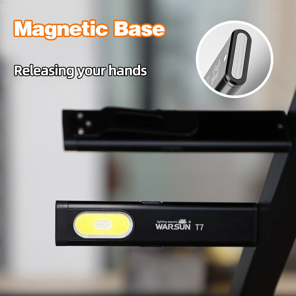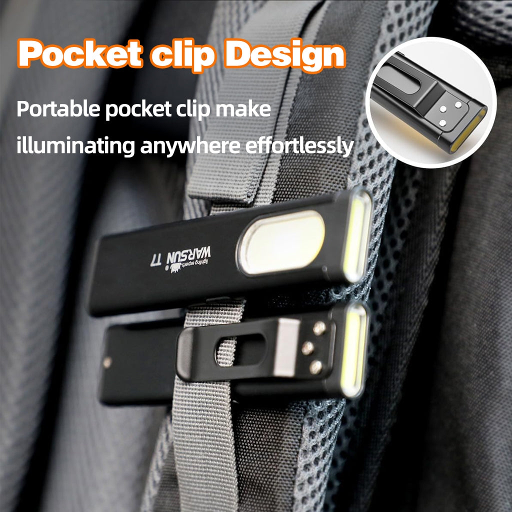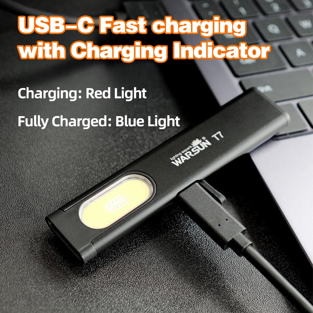 【Product information】 ➣ Model: T7➣ Material: Aluminium alloy+ABS➣ Brightness: 450Lm(≥40 M)+200Lm➣ Battery capacity: 450 mAh➣ Work Time:2-10 hours➣ Waterproof grade: IPX4➣ Charging method: Type-C➣ Weight: 50G➣ Size: 106*25*15mm➣ Others: Bottom magnetic suction 【Product Description】☆【IPX4 Waterproof Torch Light】Engineered with IPX4 splash-resistant rating, this compact flashlight survives rainy hikes and damp camping nights.At merely 50g, it''s your go-to waterproof companion for outdoor adventures without bulkiness.☆【650-Lumen Camping Flashlight】Experience brilliant 360° illumination with Warsun T7''s 650-lumen output.Six adjustable modes (from moonlit soft to spotlight strong) adapt to hiking trails, tent setups, or household emergencies effortlessly.☆【Smart Runtime Management】The 450mAh battery lasts 10 hours on medium mode.Quick-access modes prevent power aste – switch to eco-light for prolonged camping trips effortlessly.☆【Palm-Sized Outdoor Essential】Designed for backpackers, the credit-card-sized body slips into pockets effortlessly.Military-grade aluminum casing withstands drops while maintaining featherlight portability for climbing/camping.☆【Family-Ready Safety Torch】From blackout emergencies to backyard BBQs, this waterproof flashlight serves dual roles. Magnetic tail base sticks to metal surfaces, freeing hands for setting up tents or fixing bikes during family outings. 【Package includes】 1 * Flashlight 1 * Charging cable