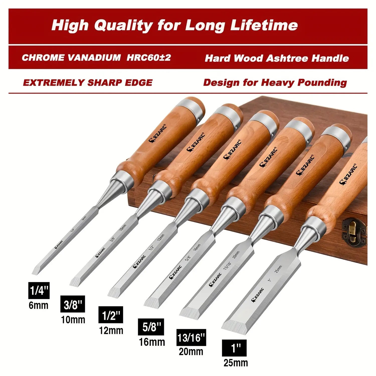 The EZARC premium wood chisel set features multiple sizes, including 1/4-inch / 6mm, 3/8-inch / 10mm, 1/2-inch / 12mm, 5/8-inch / 16mm, 13/16-inch / 20mm, and 1-inch / 25mm, making it perfect for all your woodworking projects.This set will certainly make an impression, whether you are an experienced woodworker or a beginner.