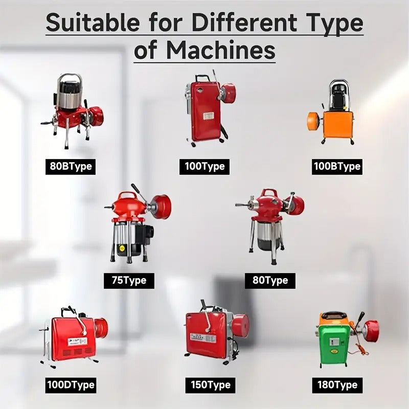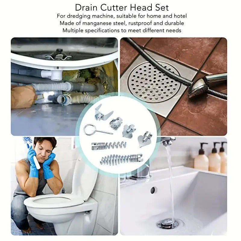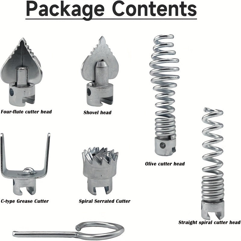 A variety of cutting heads for the dredging machine: Includes 1 key and 6 unique cutting heads (Olive cutter head, Straight spiral cutter head, C-type Grease Cutter, Spiral Serrated Cutter, Shovel head, Four-flute cutting head) to tackle various blockage issues.