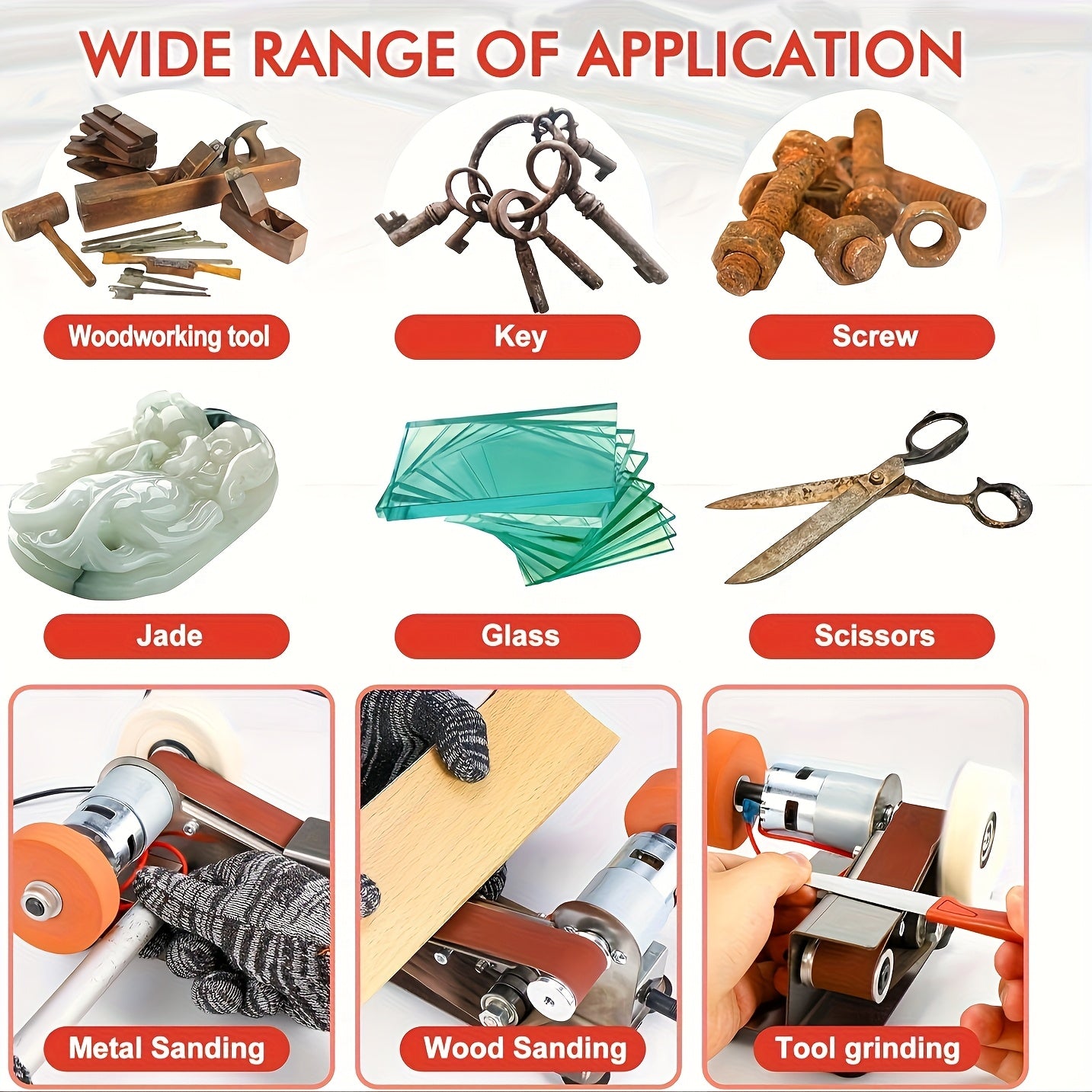 Small electric belt sander is a multi-functional tool, besides the already mentioned knife making and sharpening, it has the following functions and uses: Sharpening tool edges: in addition to knives, it can also be used to sharpen the edges of other tools such as files, axes, scissors, etc. Sanding metal surfaces: for removing rust, removing old paint layers, sanding welds, etc. Shaping and finishing edges: for edge sanding and shaping of materials such as wood, plastic and metal.