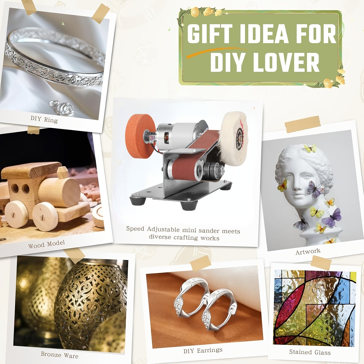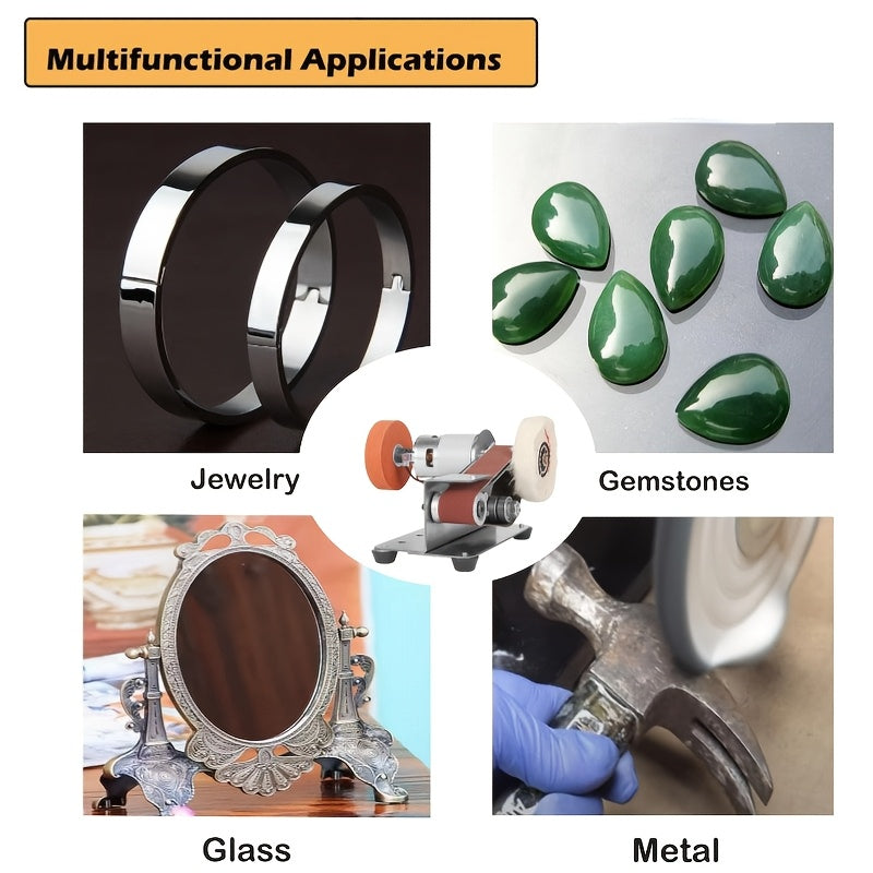 Motor: double output shaft 775 Speed Control Mode: 7-speed control Rotating Speed: 12v: 4000RPM / 24v: 9000RPM Belt size: 330*30mm(13inch x 1.2inch) Accessories: 1 x Power Adapter, 20 x Sanding Belts, 1 x Grinding Wheel