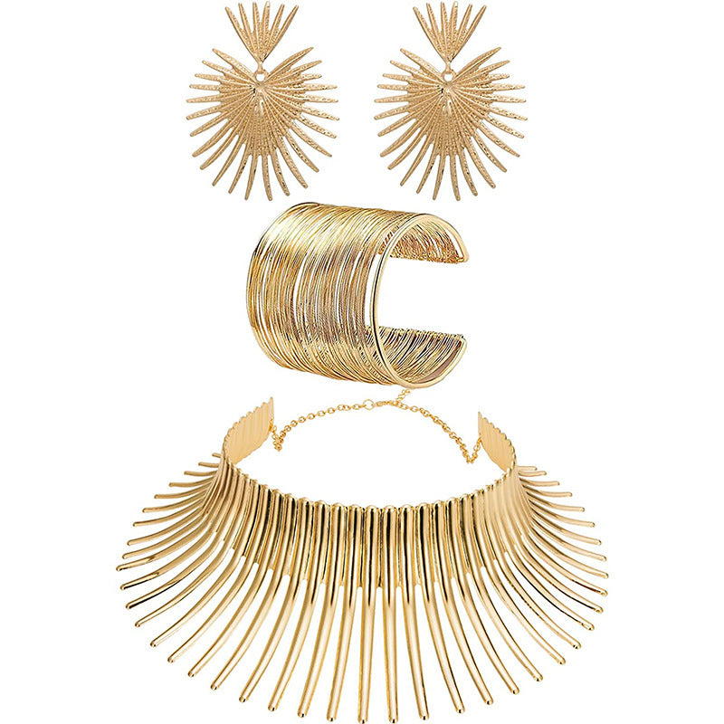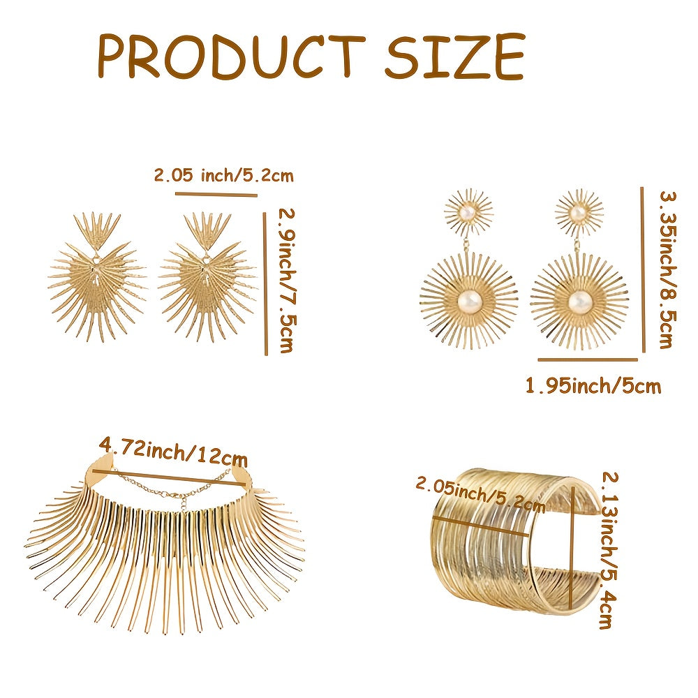 [SIZE INFORMATION]The inner diameter of choker nelace is approx.12cm /4.72 inches with 5cm extension chain.Golden bangle bracelet features open cuff design, suitable for most women.Metal statement earrings are approx.5.5*7cm /2.17*2.76 inches and 5*8.5cm/1.97*3.35 inches respectively.