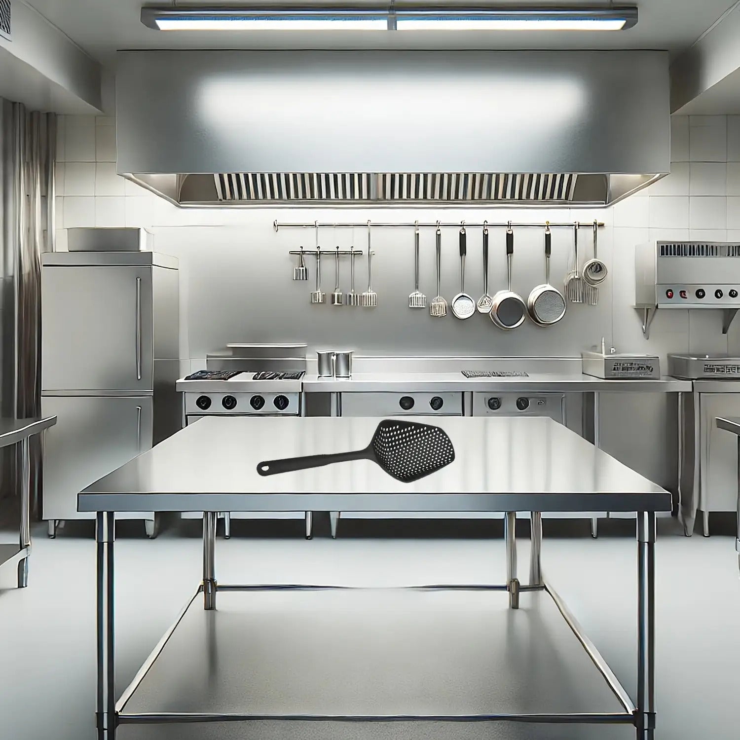 The heat-resistant scoop colander serves to strain hot or cold dishes, including fried foods. Versatile in use, it can filter water, vegetables, fruits, pasta, meatballs, and eggs. Crafted from premium materials, this draining spoon is resistant to rust and deformation, ensuring reliability and durability. Featuring an all-in-one design with a handle-end hole for convenient storage and space-saving.