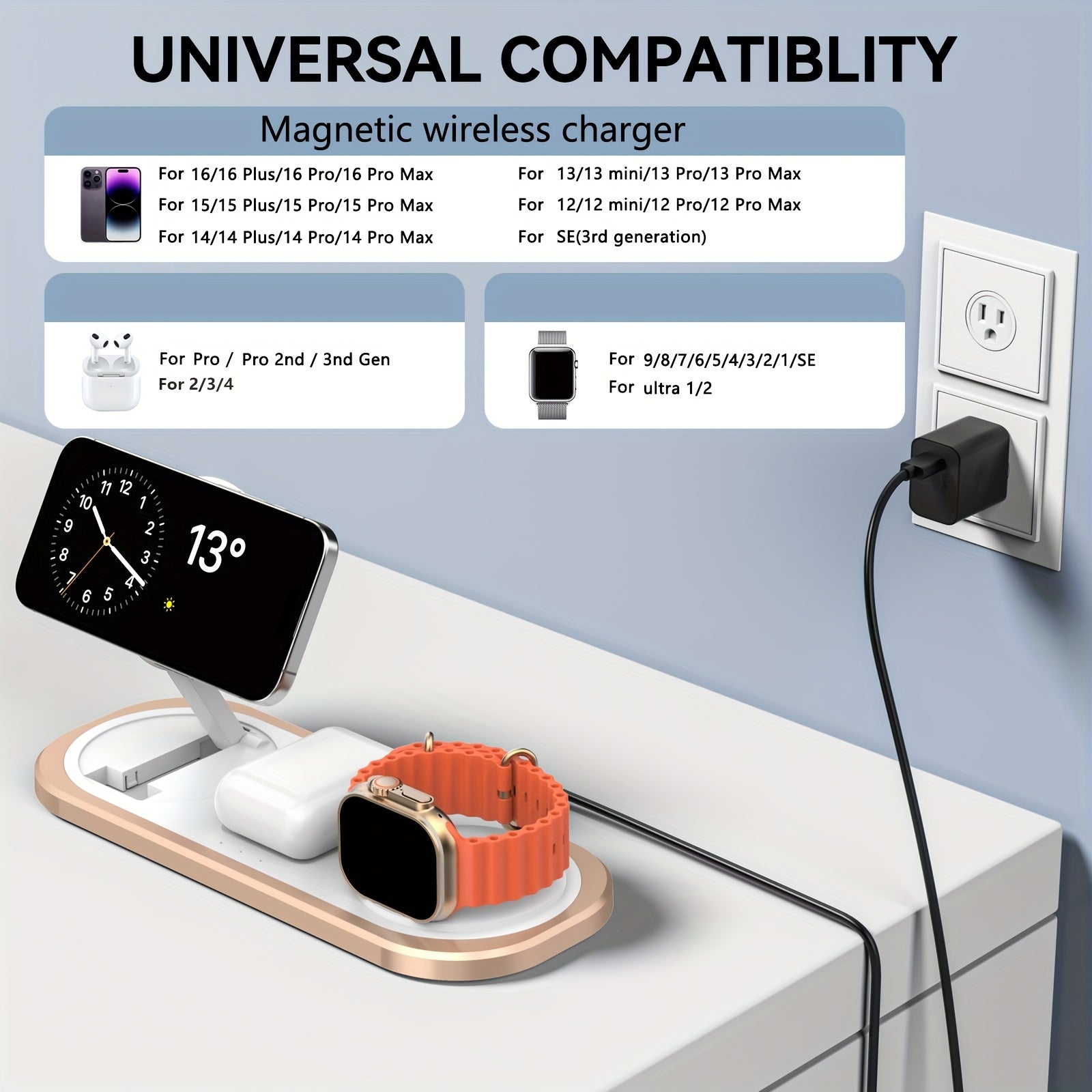 A 3-in-1 wireless charging dock that quickly charges iPhones, iWatches, AirPods, Samsung devices, and all other Qi-compatible gadgets. This fast charger is designed for various models including iPhone 16, 15, 14, 13, 12, 11 Pro Max, XR, XS, and 8 Plus, as well as Samsung Galaxy S23, S22, S21, S20, and Galaxy Note series. It also supports iWatch models 9, 8, 7, 6, 5, 4, 3, 2, SE, and AirPods Pro 3 and 2.